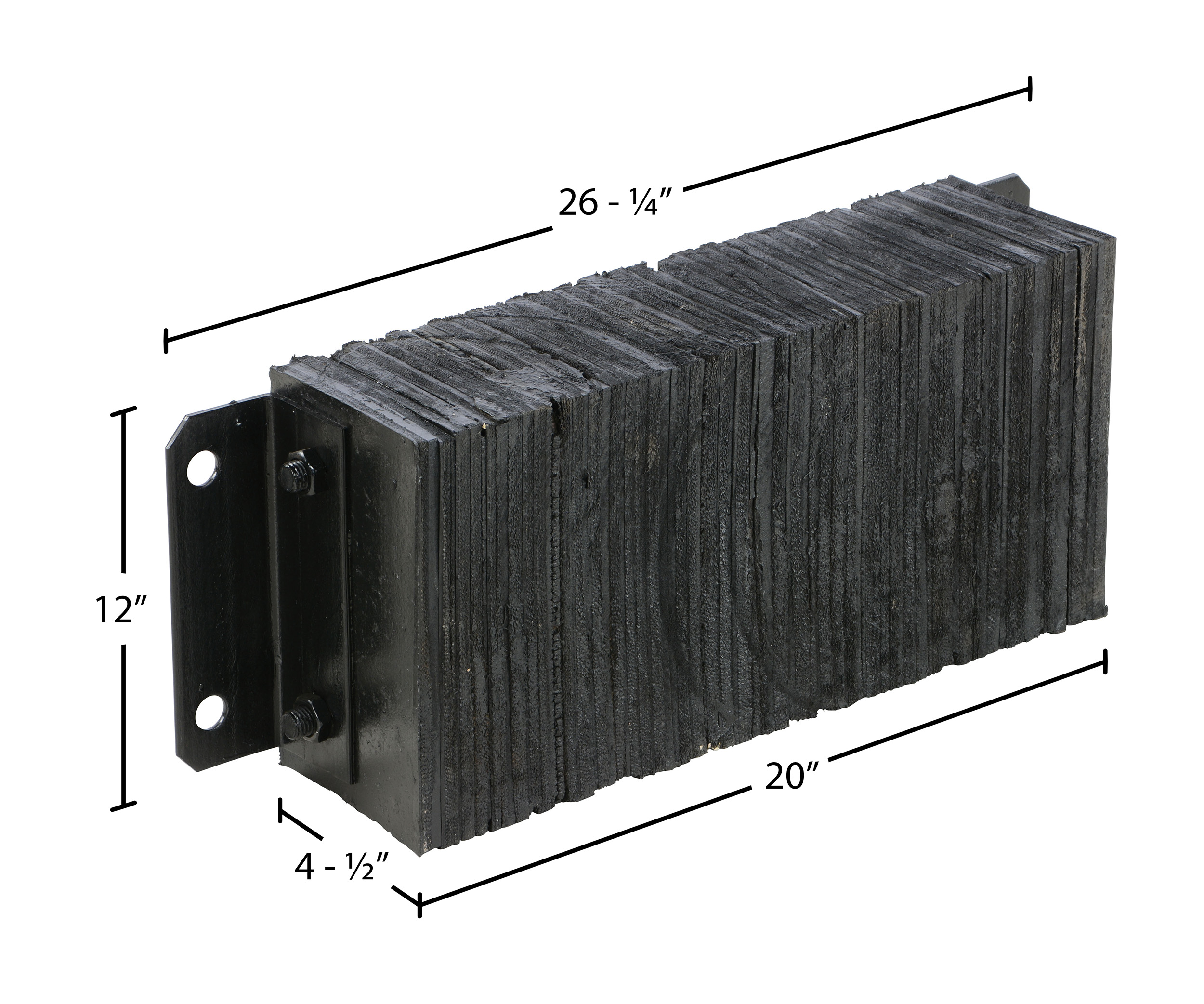 Laminated Rubber Dock Bumper 12 In. x 24 In. x 4-1/2 In. BlackThe laminated Dock Bumper provides durable, economical protection for loading docks and trailers. This unit is constructed of fabric reinforced rubber from recycled truck tires. The pads are laminated between painted structural angles and held together with steel tie rods. The width is bolt hole center to bolt hole center. Installation hardware sold separately.