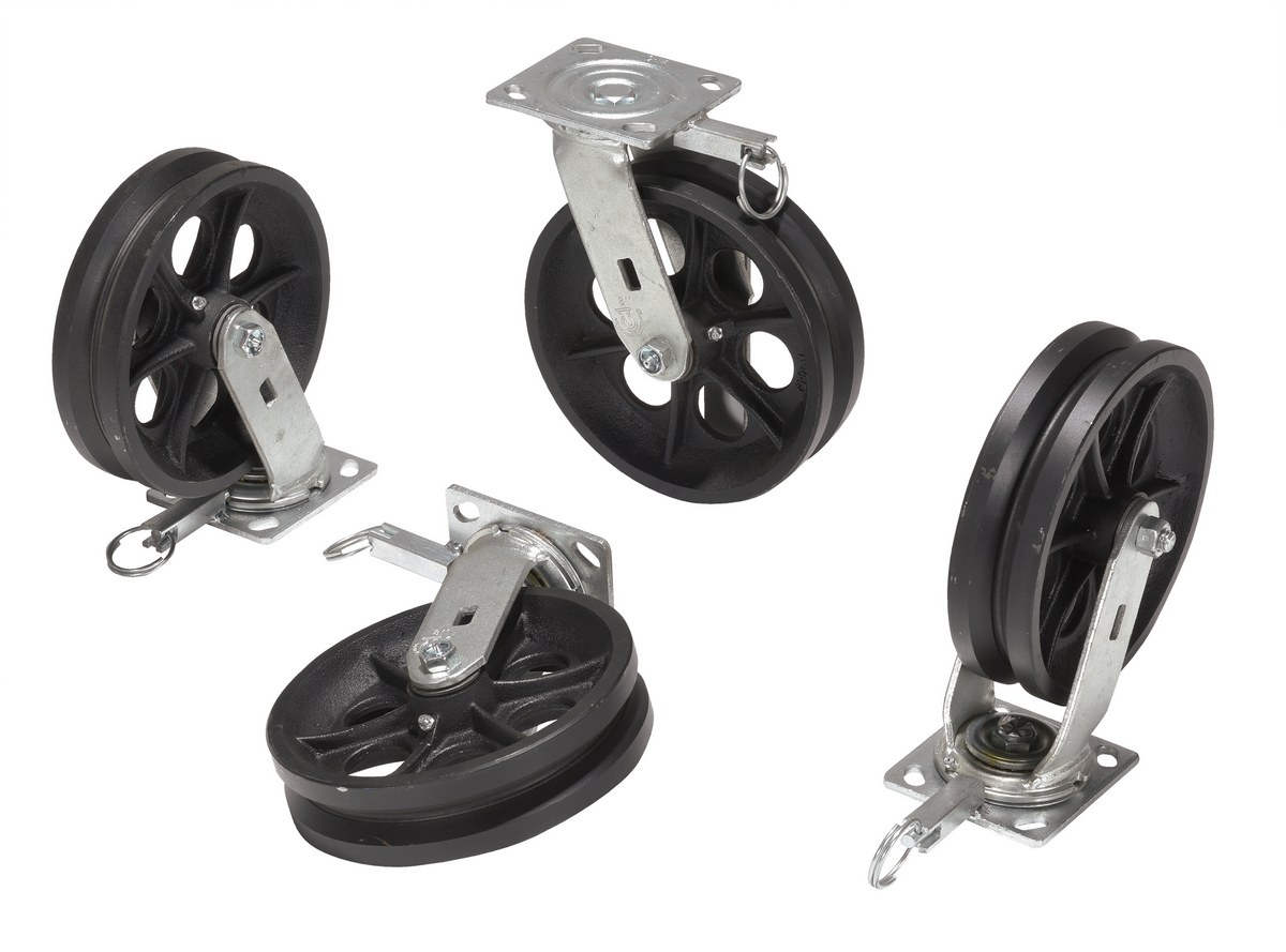 Cast Iron Swivel V-Groove Casters With 4-Position Lock 8 In. x 2 In. For Aluminum Gantry Crane ModelsThe v groove caster is a great addition to the gantry crane. The design allows the unit to be utilized on a stable track for precise positioning. Simple installation with the pre drilled mounting holes.