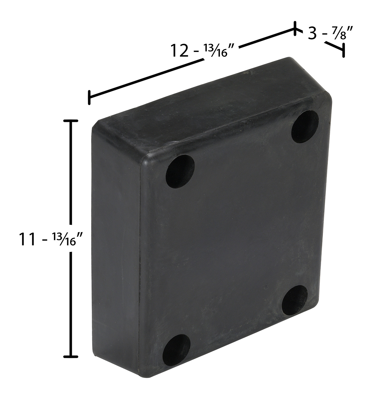 Rubber Molded Bumper 12-13/16 In. x 11-13/16 In. x 3-7/8 In. BlackThe specialty molded Dock Bumper is manufactured from fiber reinforced prime rubber containing nylon and polyester. This molded bumper is built to endure years of abusive pounding. Bumper has pre-drilled countersunk mounting holes for easy installation. The installation hardware is available separately.