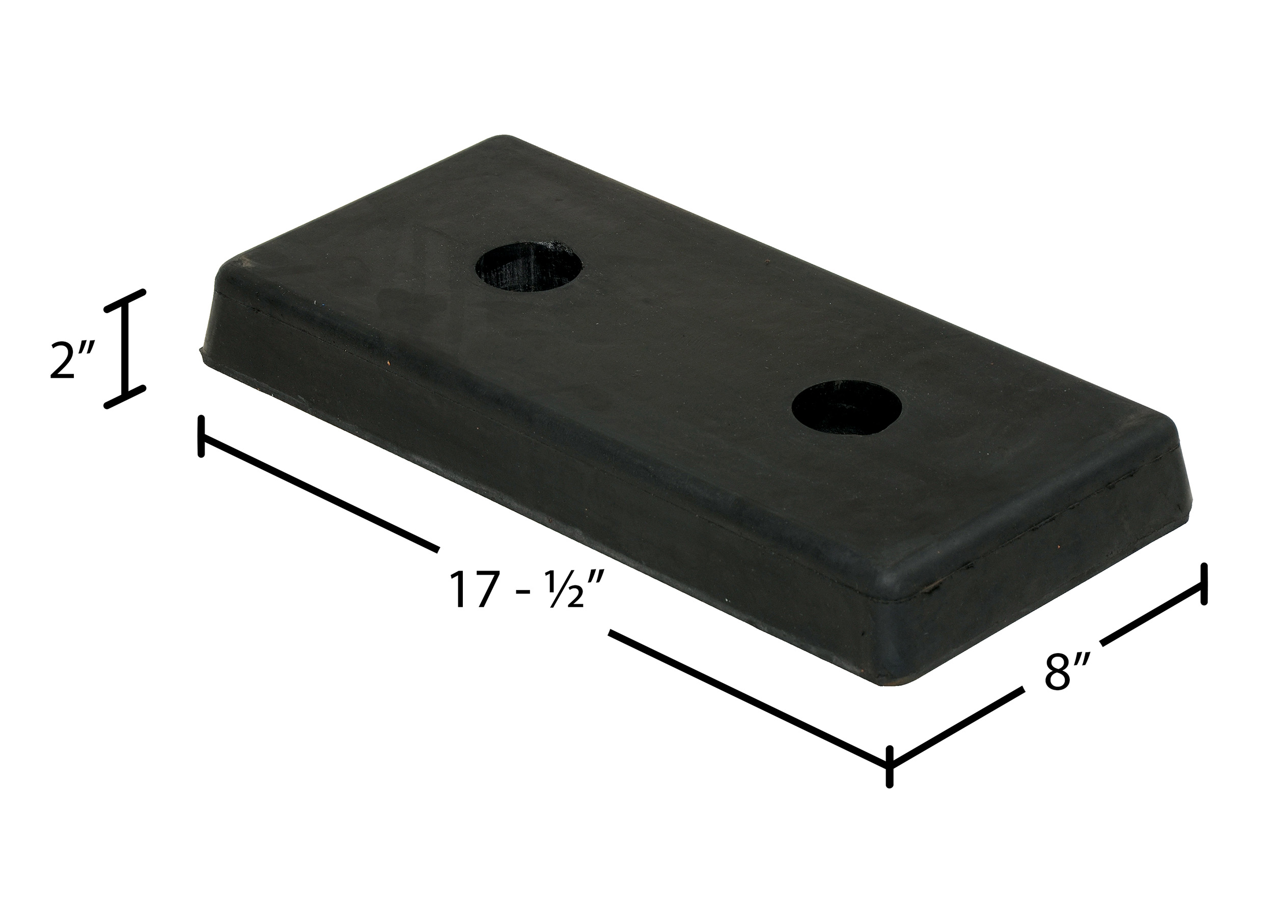 Rubber Rectangle Molded Bumper 17-1/2 In. x 8 In. x 2 In. BlackThe specialty molded Dock Bumper is manufactured from fiber reinforced prime rubber containing nylon and polyester. This molded bumper is built to endure years of abusive pounding and has pre-drilled countersunk mounting holes for easy installation. Bumper offers a plastic face bumper that features a two (2) piece construction fully assembled and ready for installation. The installation hardware is available separately.