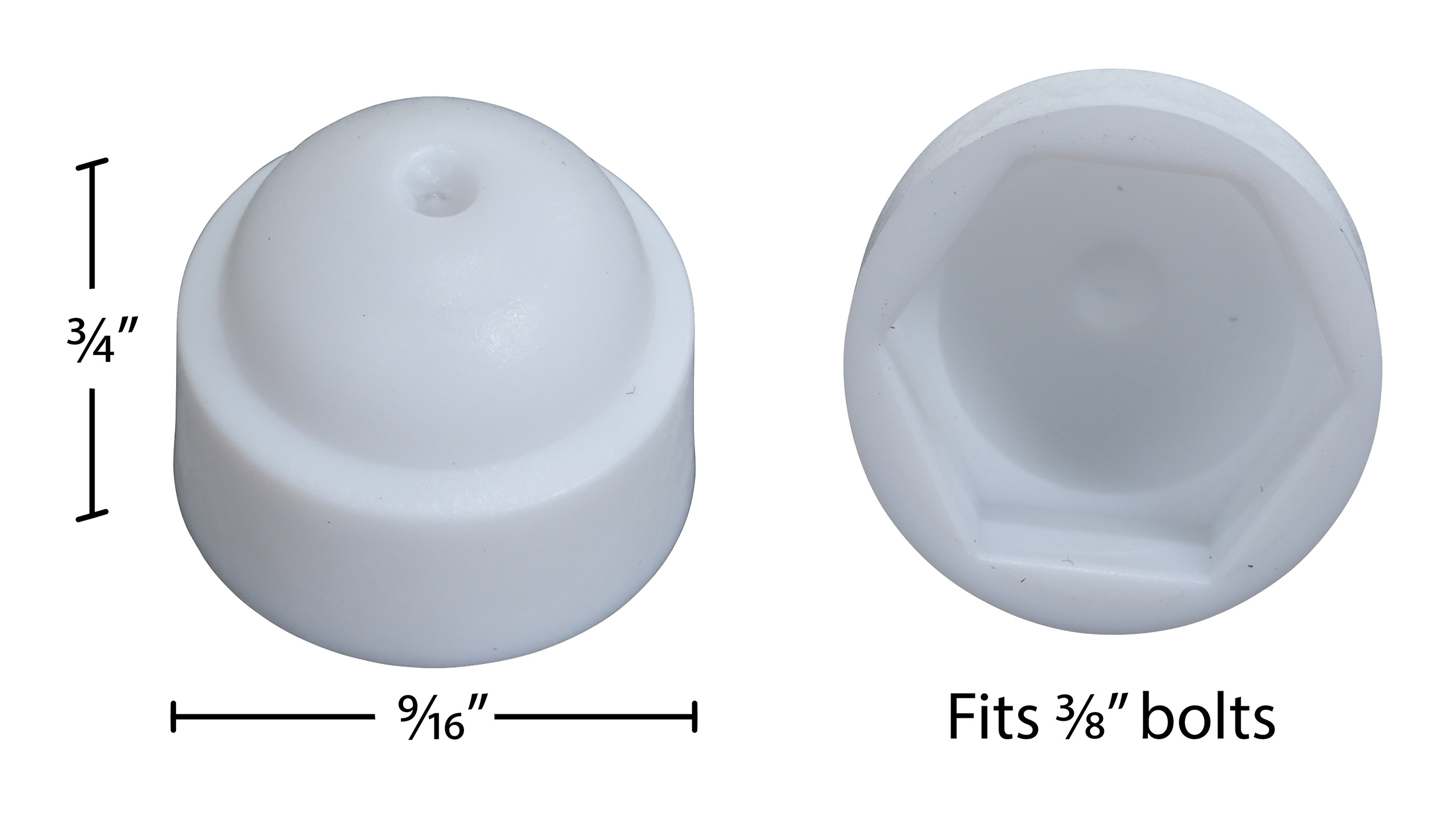 Plastic Bolt Caps 50 Pack 3/8 In. Anchor Size WhiteBolts covers are designed to shield against possible abrasion or damage. They have an easy press fit installation over the existing nut. Caps snap over the top of anchor bolts and washers to protect from weathering.
