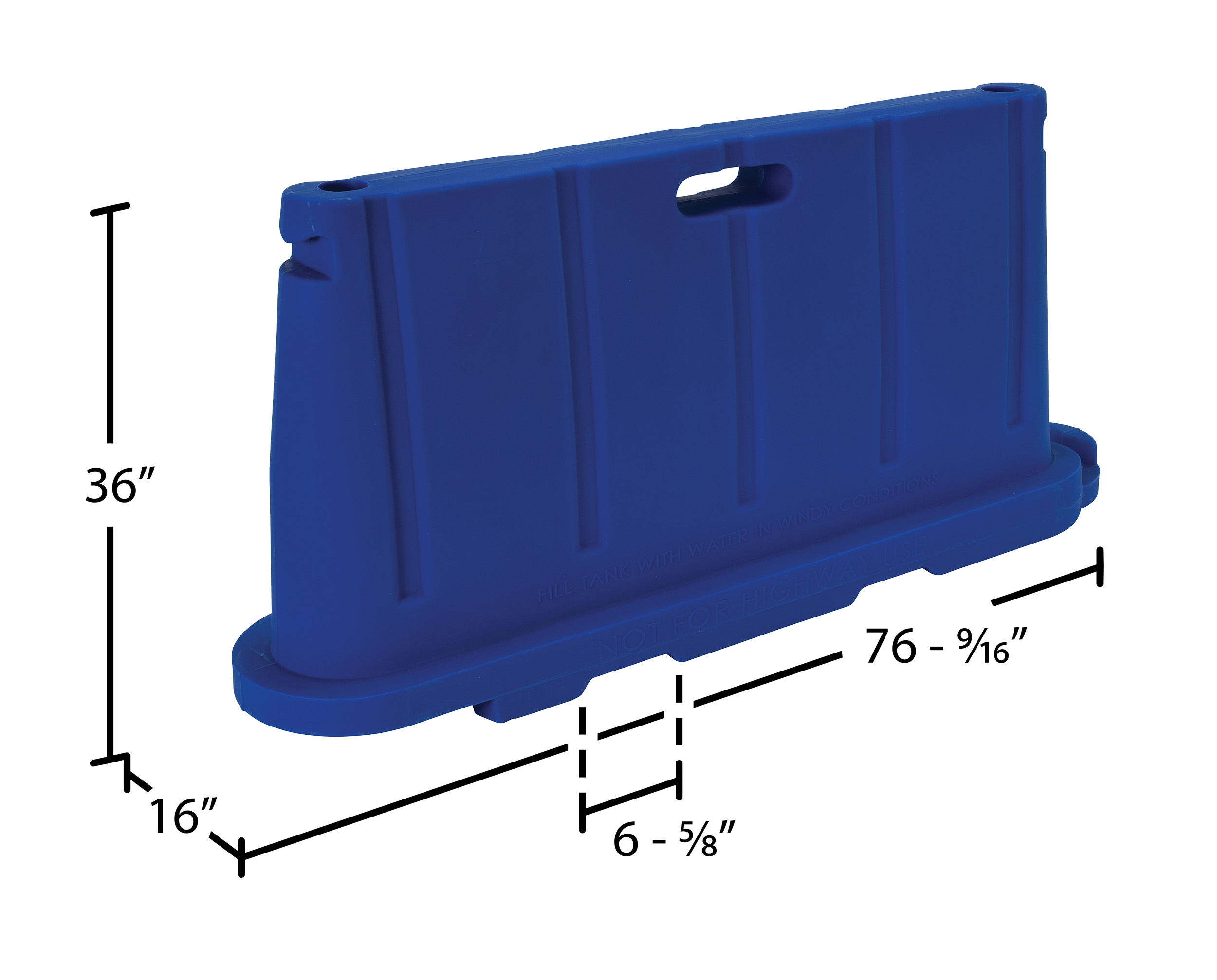 Polyethylene Stackable Barricade 76-1/2 In. x 16 In. x 36 In. BlueThe portable barrier is ideal for traffic and crowd control. The unit can be filled with water or sand for added security. The barriers have additional forklift slots on the bottom of the unit for easy transportation and can be stacked during storage for extra space. Special colors and custom mold in graphic labeling is available upon request.
