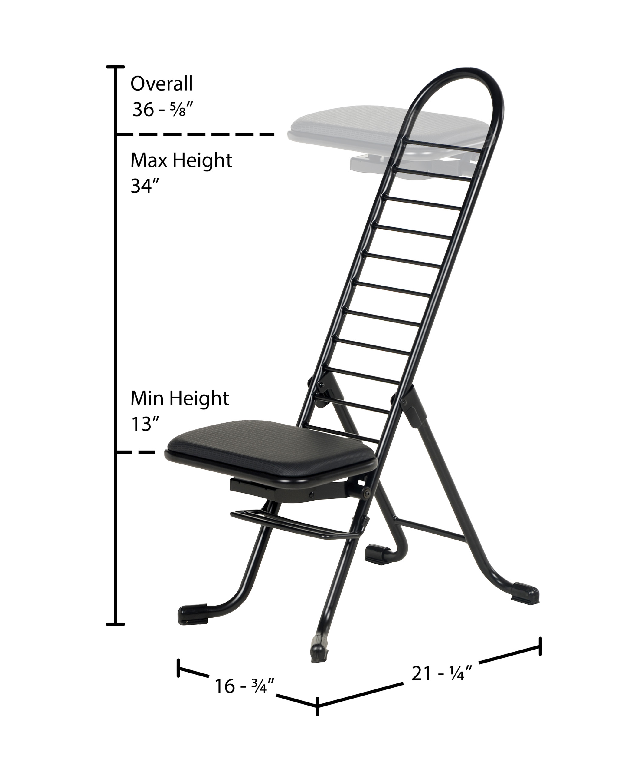 Steel Height Ergonomic Worker Chairs 13 In. to 34 In. 220 Lb. Capacity BlackThe Ergonomic worker seat allows individuals to go from a low crouch position to a standing position. The seat height can be adjusted by moving the seat and hooking in to the horizontal bars located on the chair frame. The unit has four rubber "shocks" under the seat base that allow the seat to tilt forward, left, and right so it can accommodate your body movements. The front tilted position of the seat helps the user maintain the natural posture position of the spine. Footrest included.
