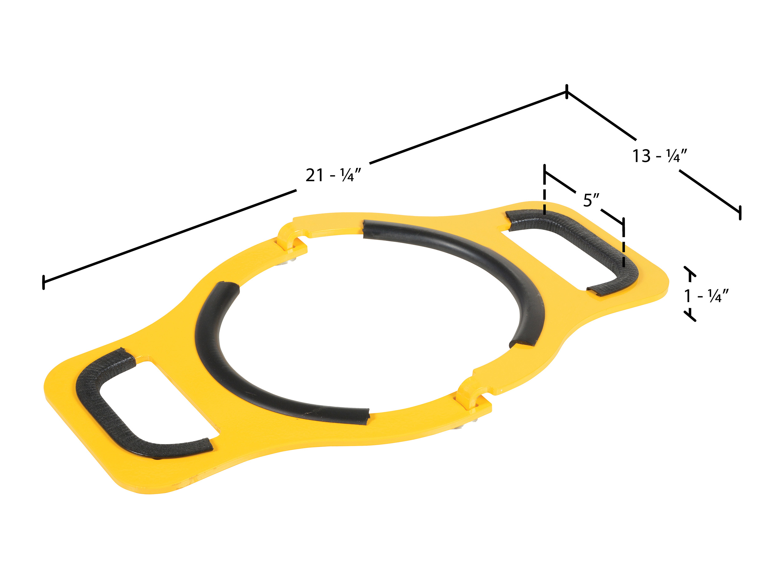 This manual Cylinder lifter is easy to use and allows for safely lifting cylinders. The pivoting design grabs and squeezes the cylinder when lifted. The lifter has a rubber-coated center and handle holes. Steel construction with a powder-coat yellow finish.