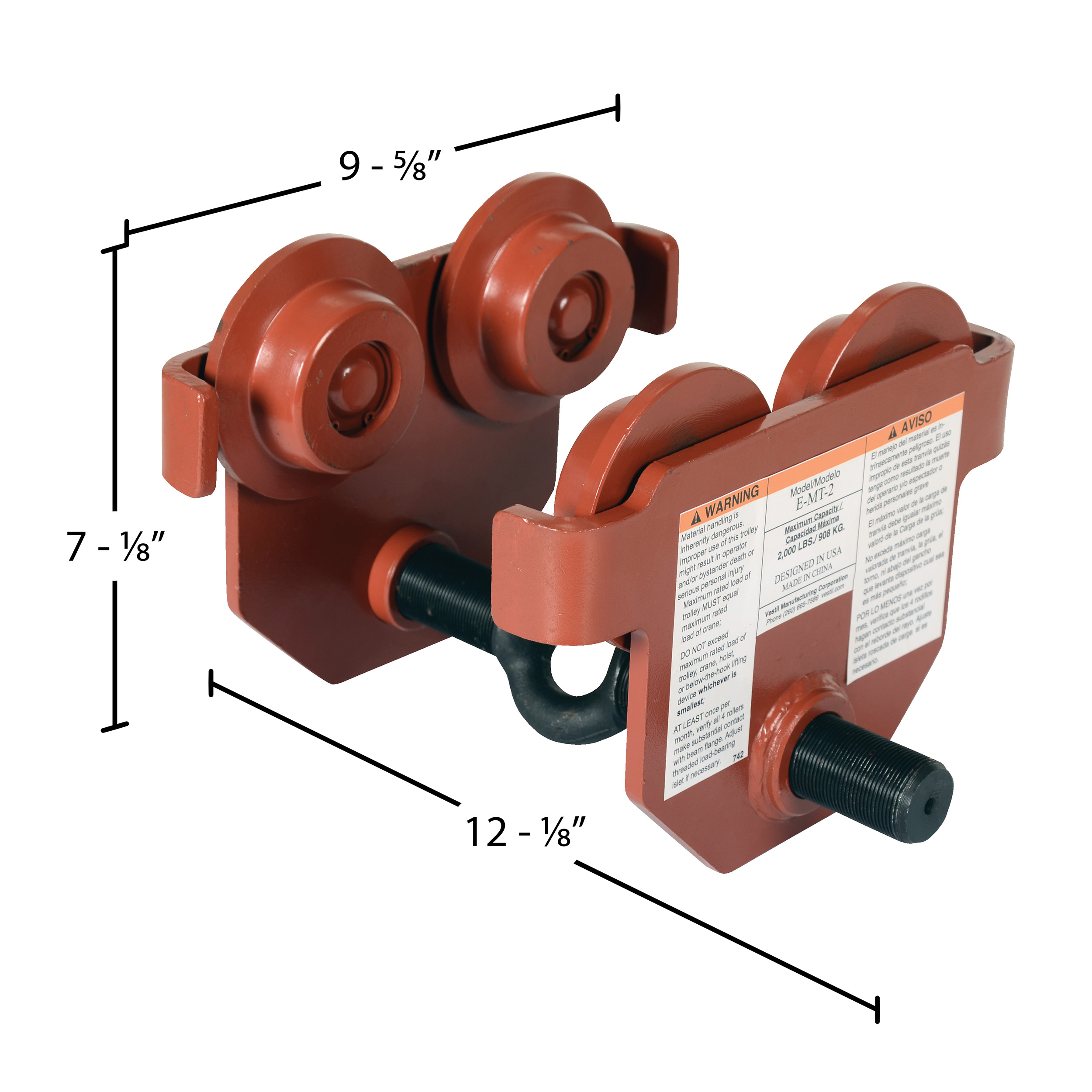 Steel Push Eye Manual Trolley 2000 Lb. Capacity OrangeThis low profile manual trolley has been designed to quickly install on virtually any S, H, W and M type I-beam. The width of the trolley is adjusted by rotating the center rod with lifting eye clockwise or counterclockwise. Once the hoist (not included) is attached, the center rod cannot be rotated which prevents the trolley width from accidentally changing. This push trolley includes four (4) rollers with sealed bearings for long life. A lifting eye is located at the bottom of the trolley for attaching a hoist (not included). The trolley features steel construction and a painted finish.