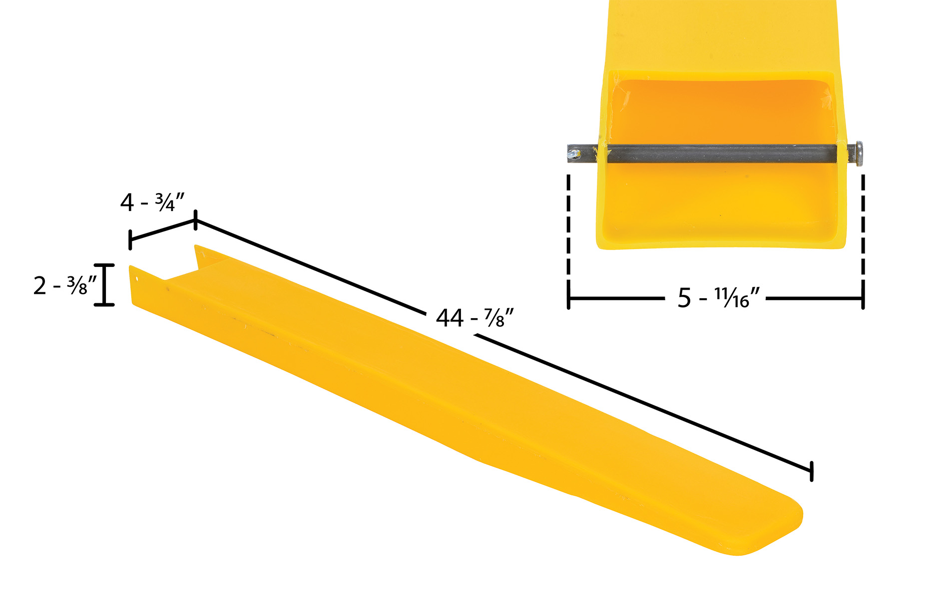 Polyethylene Fork Blade Protectors 4 In. x 42 In. YellowThe fork blade protectors are a great addition to the fork truck forks used in a variety of facilities. The unit is designed of a polyethylene construction for lightweight transference from workstation to workstation. The bright color enhances visibility for the user as well as other personnel in the work area. A simple installation onto the fork can have the protector in place and ready for immediate use.