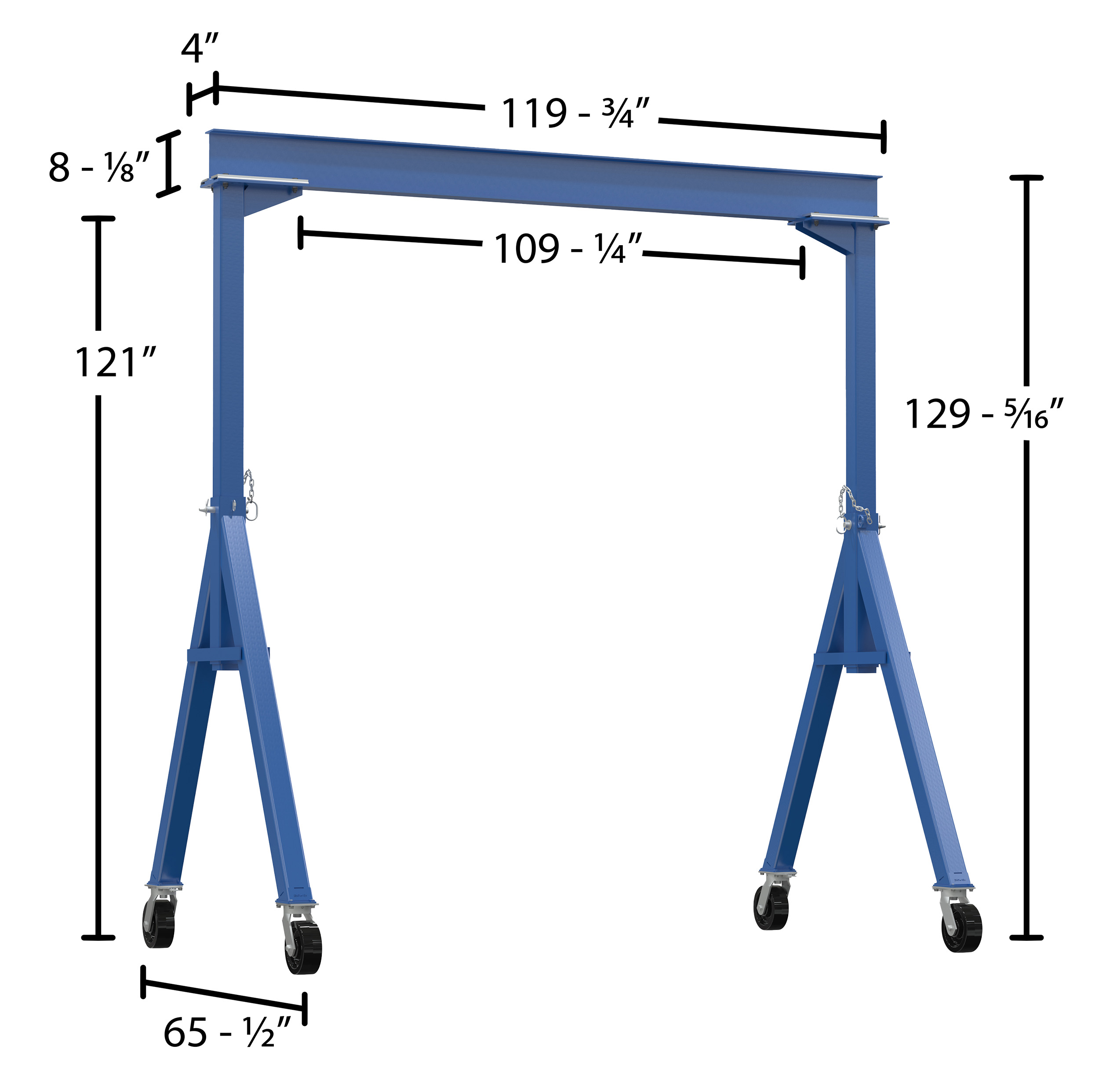 Steel Fixed Gantry Crane with Phenolic Casters 10 Ft. 4000 Lb. Capacity BlueThe fixed height steel gantry crane is designed for transporting and positioning materials along the beams length. The solid steel construction will provide years of service, while the painted blue finish will keep the models protected from surface ware. The rigging locks in 1 of 4 positions; you can set the wheels and push the gantry crane forward, back, left or right. The unit is an economical and efficient way to lift and raise products, diminishing the need of additional personnel. The fixed height design allows for constant use in a particular setting without the need to maneuver the overall height of the unit.
