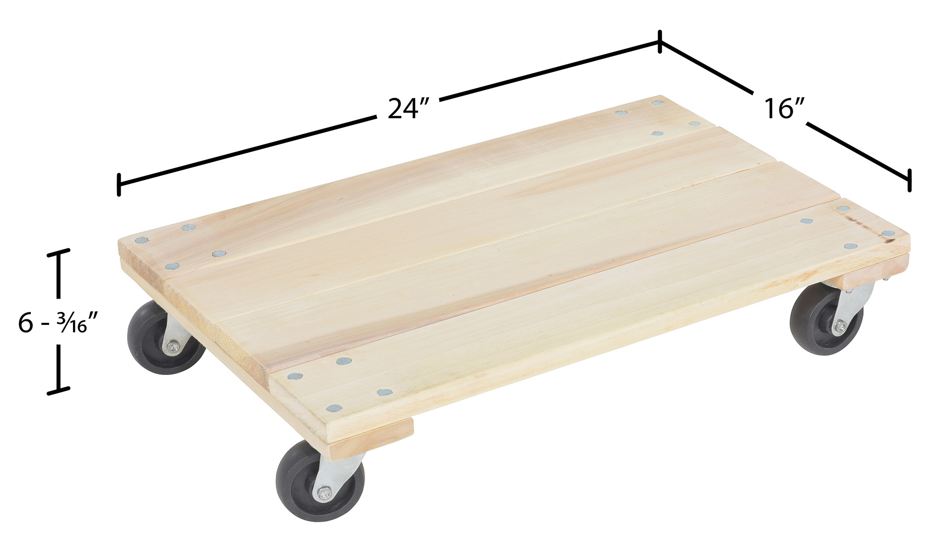Poplar Solid Deck Dolly 24 In. x 16 In. x 6-3/16 In. 900 Lb. Capacity TanThe hardwood dollies are great for the shipping and handling industries. The robust design maneuvers over a variety of conditions due to the included rubber casters. The full construction allows units of diverse sizes to be transported from work area to work area. Assembly required. Optional pull strap or hook available.