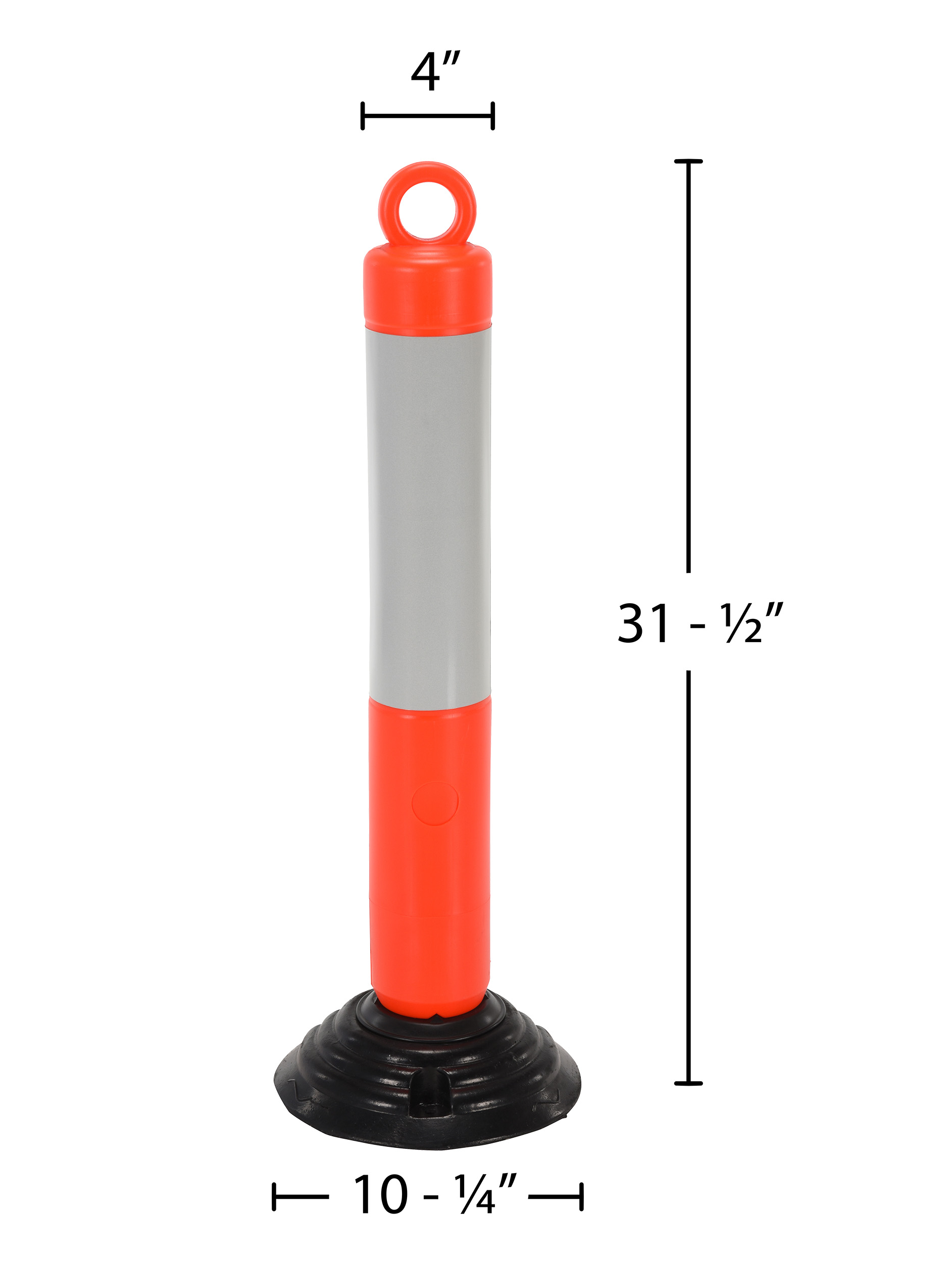 Plastic Bollard 10-1/4 In. x 10-1/4 In. x 31-1/2 In. Height Fluorescent OrangePlastic bollards are engineered for safety and the reduction of accidents. A fluorescent orange color scheme with white reflective tape promotes safety and visibility. A loop located at the top of the unit enables easy handling and is ideal for any workplace. Spring loaded for forgiveness when contact by an outside force. Base has 3 holes for mounting to surface. Hardware for mounting base is not included.