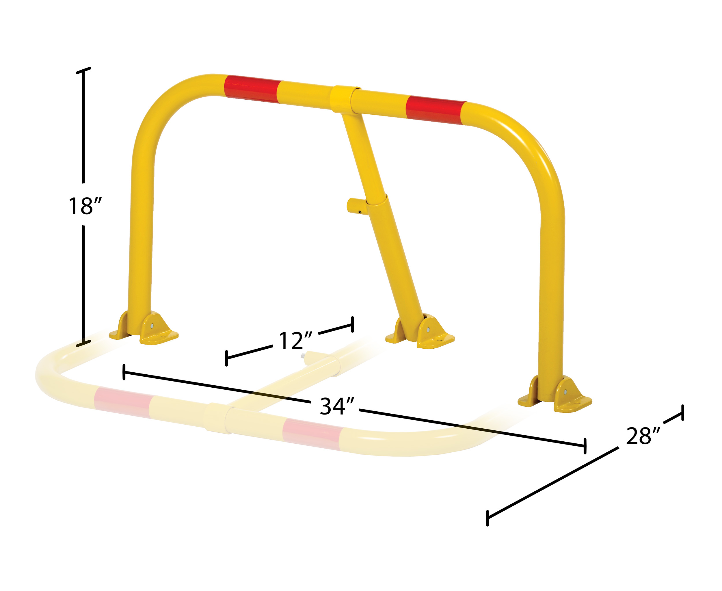Steel Heavy Duty Fold Down Parking Hoop 34 In. x 12 In. x 18 In. YellowThe hoop bollards are ideal for industrial and distribution facilities. The heavy duty, steel construction is durable and long lasting through the harshest of environments. When engaged, the parking hoop is both a visual and safety barrier. Easy to operate. Secures in both open and closed position via internal lock, two (2) keys included. Reflective bands and mounting hardware included.