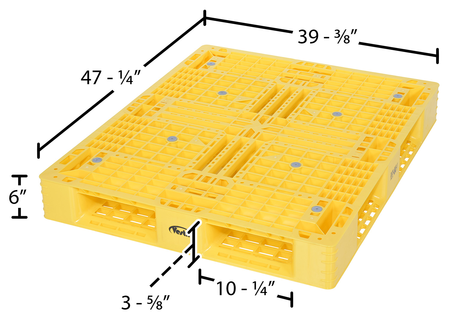 High Density Polyethylene Pallet 39-3/8 In. x 47-3/8 In. x 6 In. 8000 Lb. Capacity YellowPlastic pallets are stackable for efficient storage. Made of high-density virgin polyethylene for long life. Plastic pallets are maintenance free and safer to handle than wooden pallets. Features a four-way entry and serrated deck with holes for drainage. Plastic pallets are ideal for export, pharmaceutical, medical, and food applications.