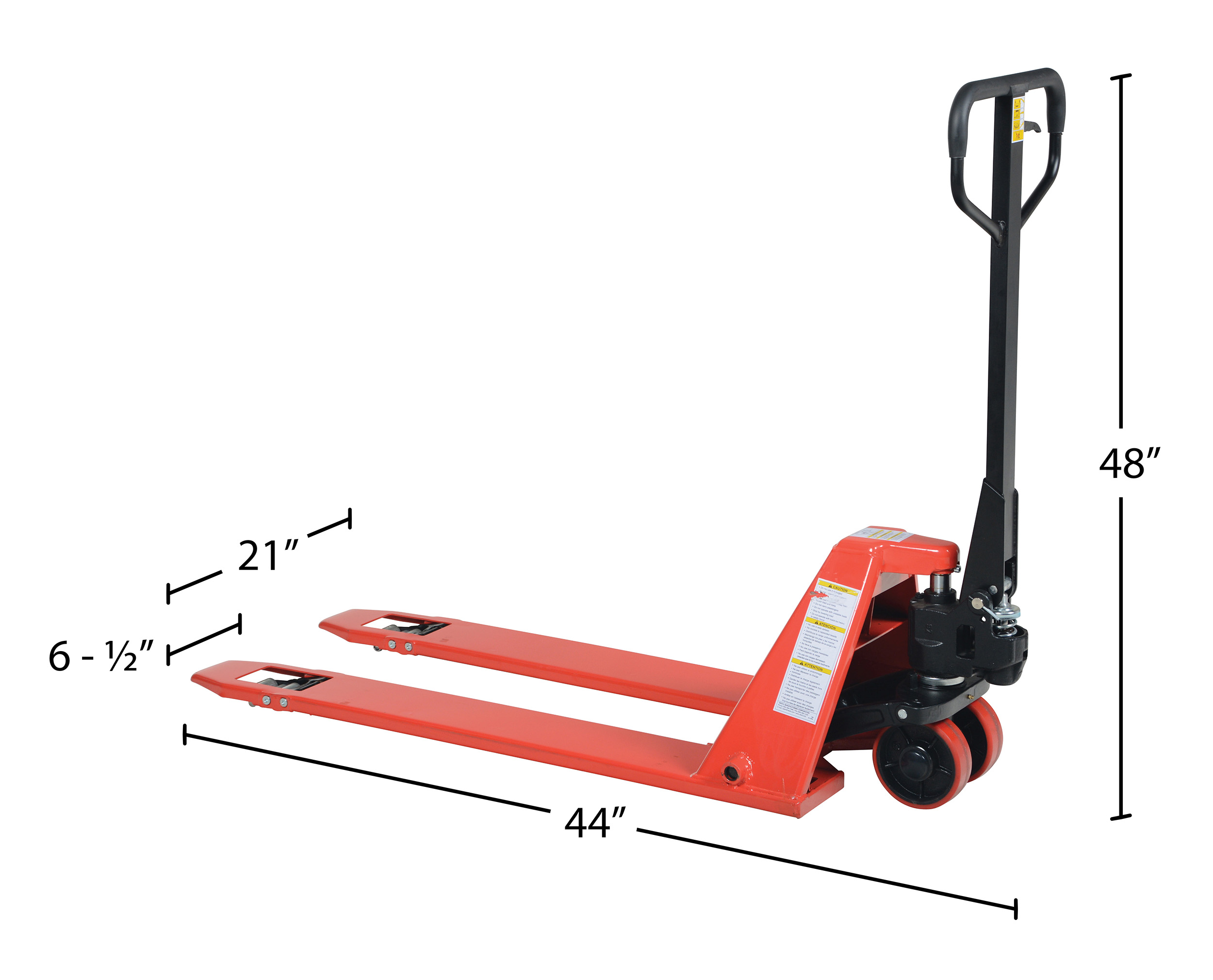 Steel Super Low Pallet Truck 60 In. x 21 In. x 44 In. 2200 Lb. Capacity RedThe super Low Profile pallet truck is ideal for extra low applications. It features a lowered fork height for extra low profile skids, pallets, or machinery. Fingertip lever for raise, lower, and neutral operation. This pallet truck has a powder coat finish and a rubber cushioned handle grip.