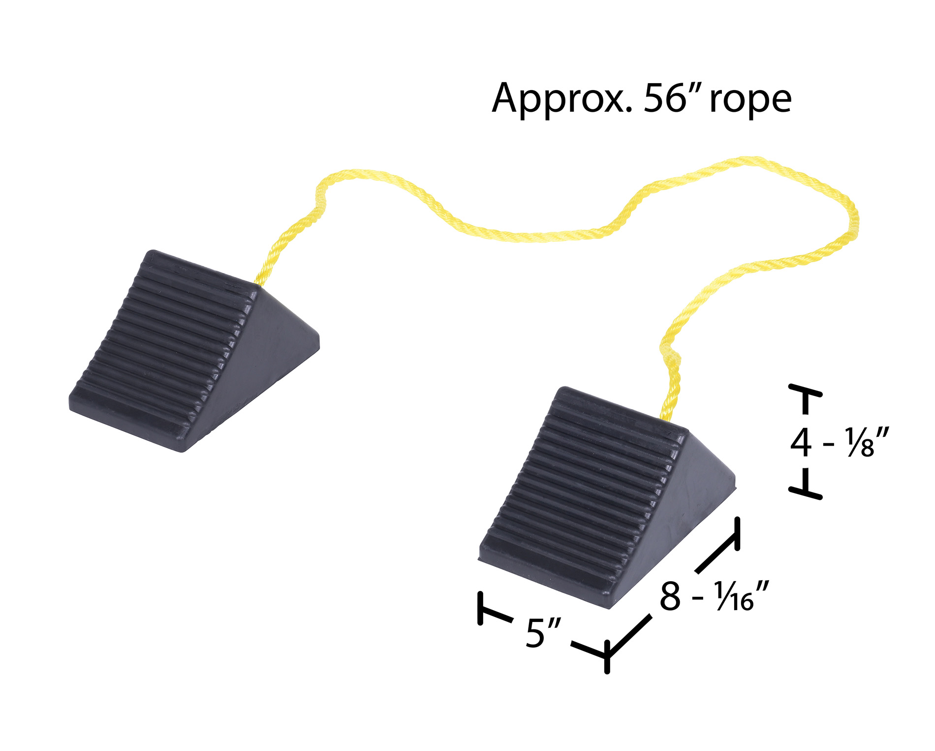Molded Rubber Wheel Chock with Rope 8 In. x 56 In. x 4 In. BlackThe rubber wheel chocks are constructed of reinforced rubber to provide a sure grip on virtually any surface. The curved surface contours to fit tires. Rubber resists tearing, abrasion, ozone weathering, etc. The functional design includes a rope connected to the chock and is durable in all weather conditions.
