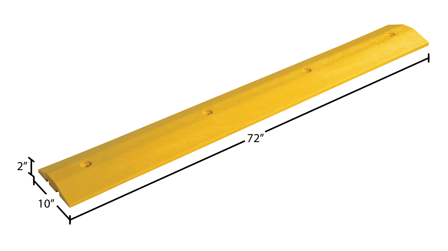 Plastic Speed Bump Concrete Hardware 72 In. x 10 In. x 2 In. YellowThe speed bump is ideal for a variety of parking areas, both inside and out. The speed bump helps to control drivers from injuring people and property. The unit can be installed/removed by one person resulting in smooth portability. The strong recycled plastic construction can be used where traffic is frequent and can hold up to the constant day to day harm from chemicals and sunlight. Features a dual cable channel. The concrete hardware kit includes bolts, anchors, and washers.