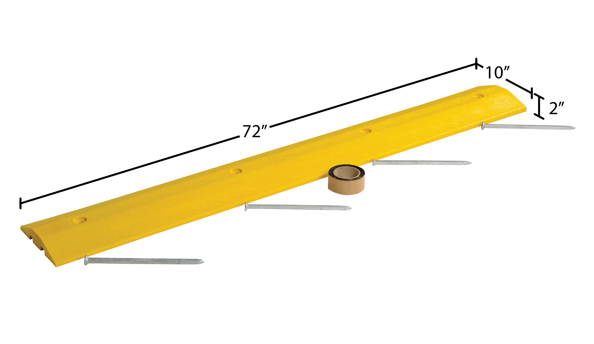 Plastic Speed Bump Asphalt Hardware 72 In. x 10 In. x 2 In. YellowThe speed bump is ideal for a variety of parking areas, both inside and out. The speed bump helps to control drivers from injuring people and property. The unit can be installed/removed by one person resulting in smooth portability. The strong recycled plastic construction can be used where traffic is frequent and can hold up to the constant day to day harm from chemicals and sunlight. Features a dual cable channel. The asphalt kit includes butyl tape and spikes.