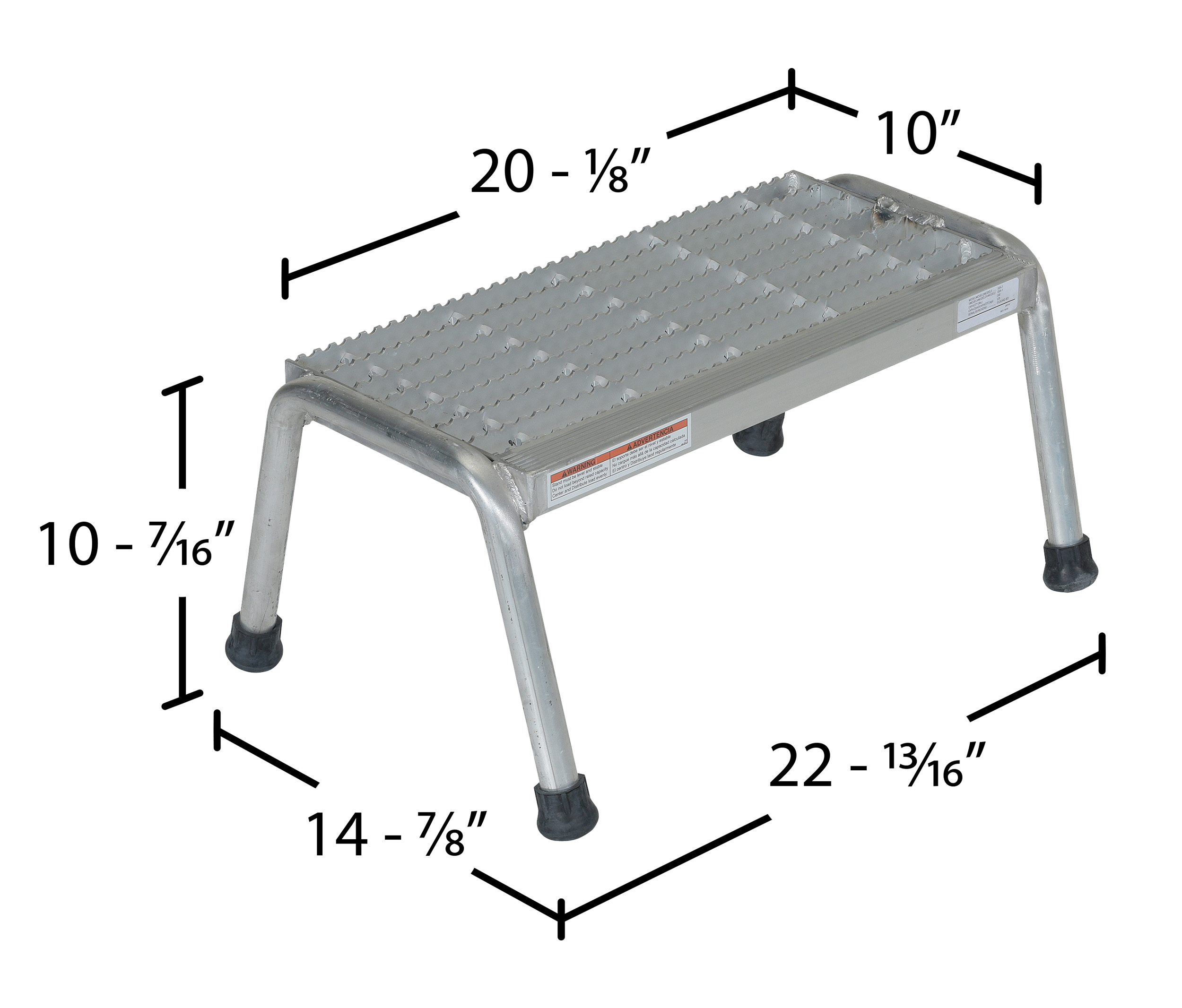 Aluminum 1 Step Stand 500 Lb. Capacity SilverThis Aluminum step stand is ideal for industrial or commercial applications. It is lighter than comparable steel models. Open step design includes extra heavy duty serrated surface for traction. With rubber tipped legs, this step ladder is ideal for use on many types floors.