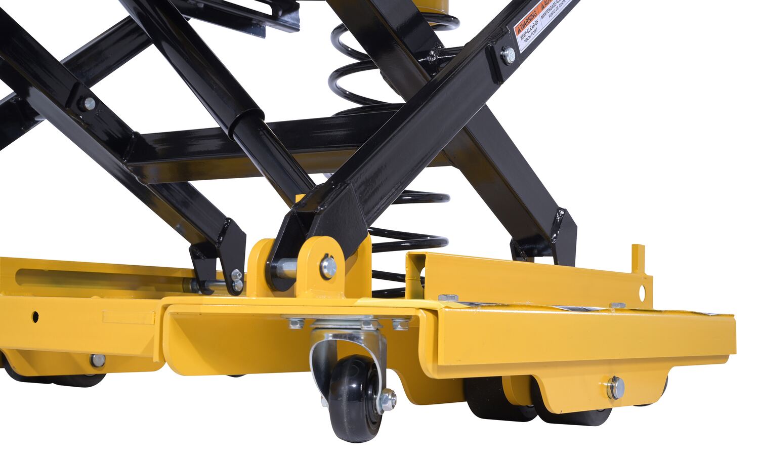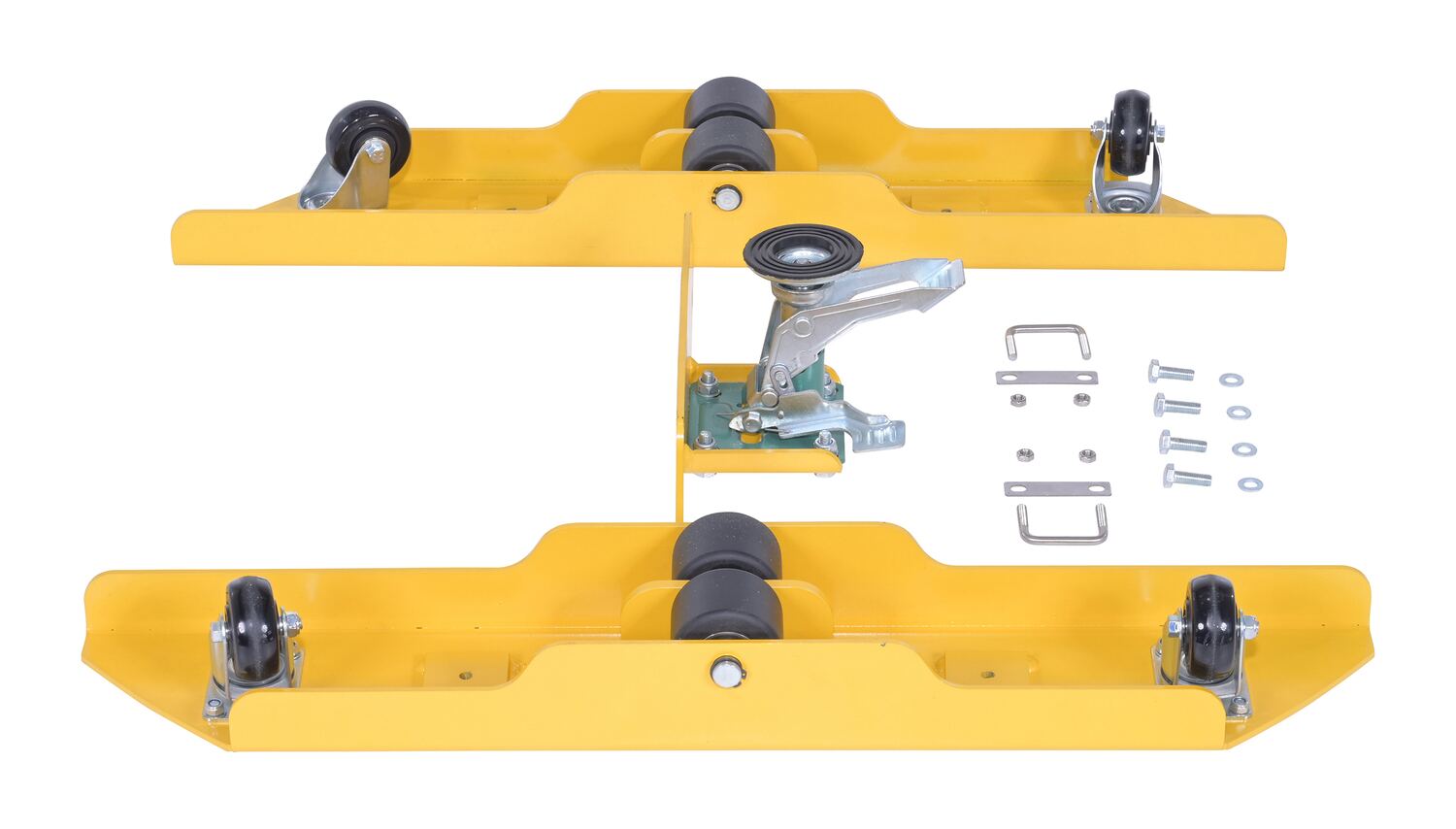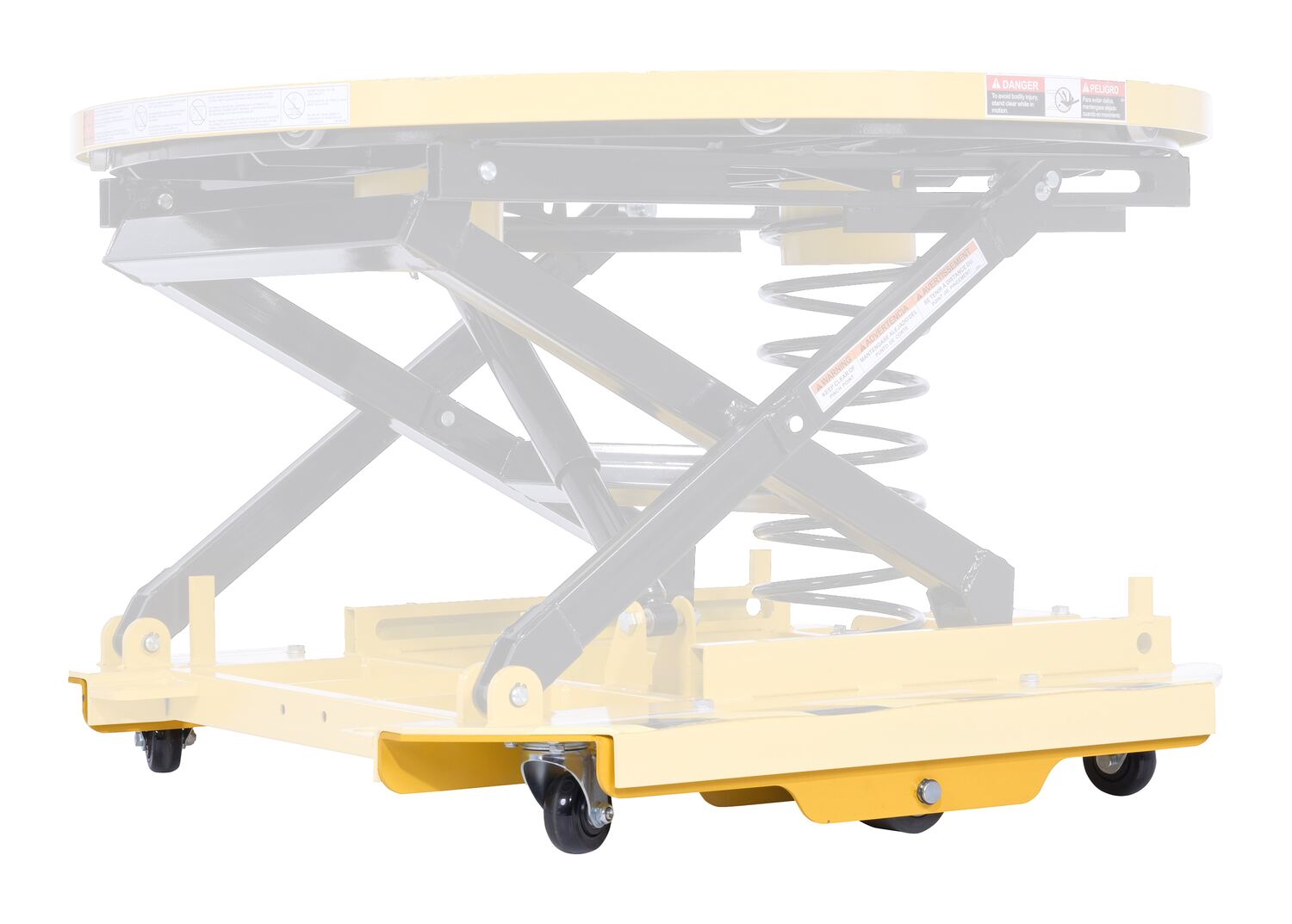 Spring Scissor Table Glass Filled Nylon Caster Kit Option 4,500 Lb. Capacity YellowTurning a stationary spring loaded table into a portable one has never been easier. With the caster kit option, the table can now be wheeled around the workplace without the needed of additional lifting equipment. The casters are attached to individual steel pieces which are then secured to the fork pockets of the existing spring loaded table. A floor brake is also included to maintain stability during loading and unloading.