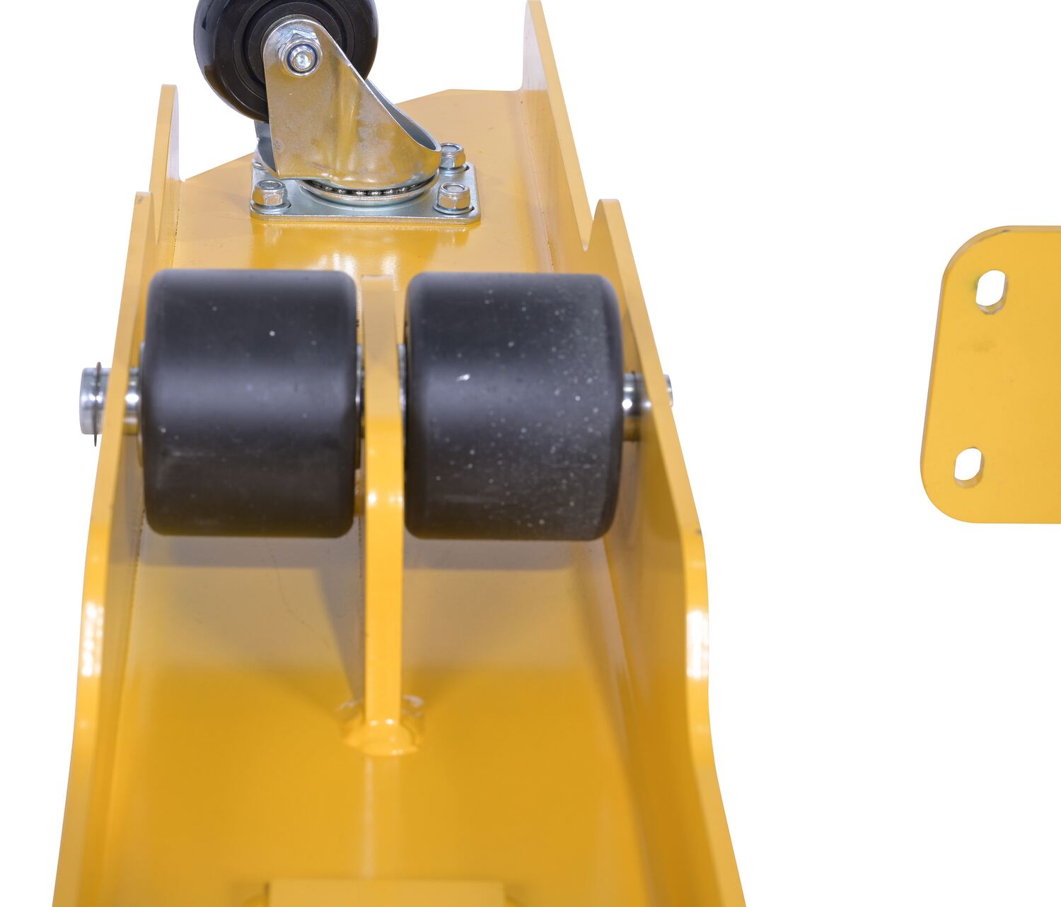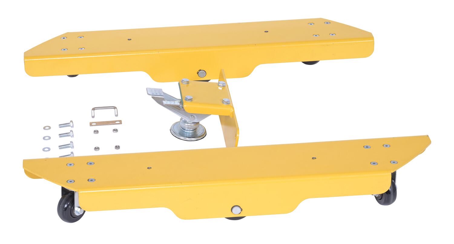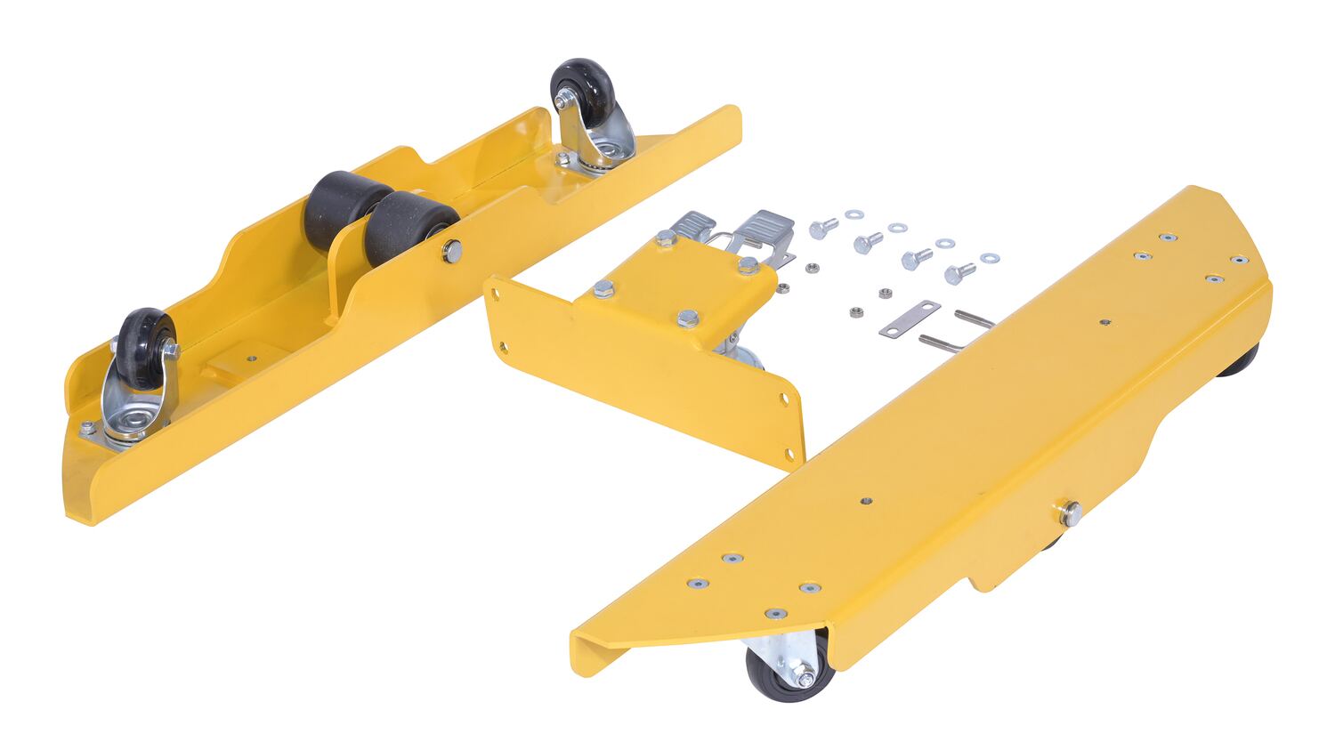 Spring Scissor Table Glass Filled Nylon Caster Kit Option 4,500 Lb. Capacity YellowTurning a stationary spring loaded table into a portable one has never been easier. With the caster kit option, the table can now be wheeled around the workplace without the needed of additional lifting equipment. The casters are attached to individual steel pieces which are then secured to the fork pockets of the existing spring loaded table. A floor brake is also included to maintain stability during loading and unloading.